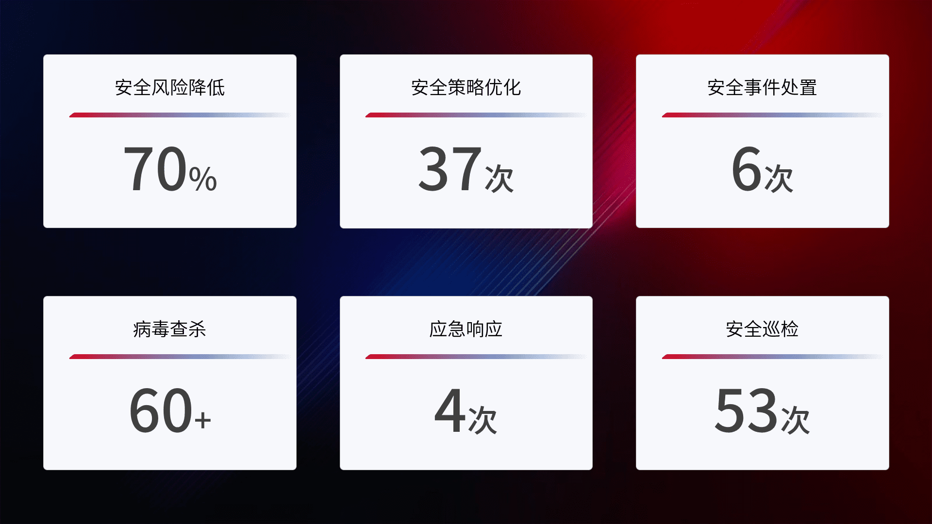 提供全面的安全事件报告体系,,包括处置报告、、、、周报、、、、季度和年度总结,,,,结合持续监控,,,帮助客户深入了解网络安全状况。。